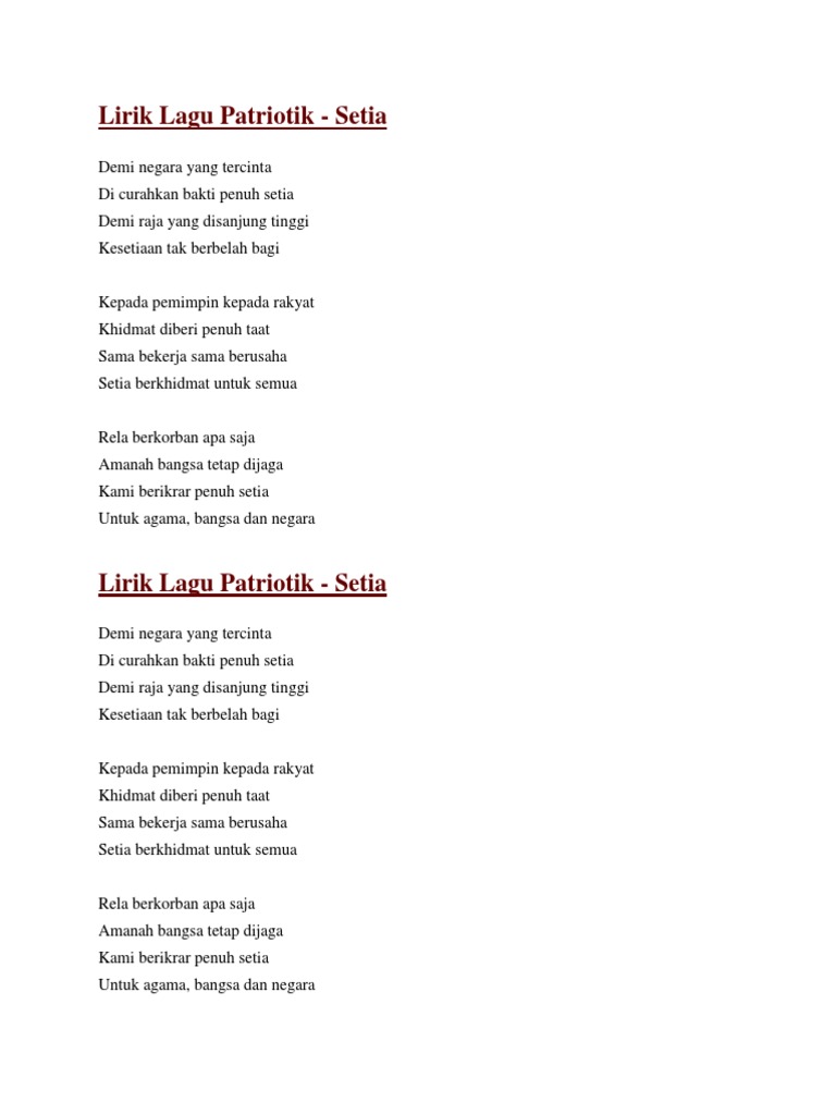 Selamat melayani Tuhan semoga ada lagu lagu Rohani terbaru lagi di tahun 2023 dan seterusnya Tuhan Yesus Memberkati. Lima cara di atas dapat menjadi langkah pasti untuk mendapatkan apa yang kalian inginkan. Lirik Lagu Setia - Lagu Patriotik Demi negara yang tercinta Di curahkan bakti penuh setia Demi raja yang disanjung tinggi Kesetiaan tak berbelah bagi.
